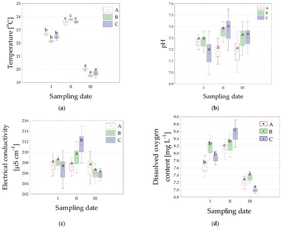 Changes in (a) water temperature, (b) pH, (c) electrical conductivity, and (d) dissolved oxygen content, in water samples in successive dates of sampling in three measurement points (A, B, C). Different letters (a, b, c) indicate statistically significant differences among sampling dates.