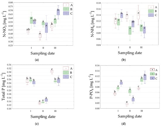 Changes in concentration of (a) NO3-N, (b) NH4-N, (c) total phosphorus, and (d) PO4-P in water samples in successive dates of sampling in three measurement points (A, B, C). Different letters (a, b, c) indicate statistically significant differences among sampling dates.