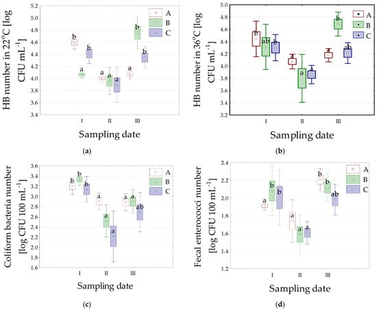 Changes in the number of heterotrophic bacteria (HB) incubated in 22 °C, (b) heterotrophic bacteria (HB) incubated in 36 °C, (c) coliform bacteria number and (d) fecal enterococci number in water samples in successive dates of sampling in three measurement points (A, B, C). Different letters (a, b, c) indicate statistically significant differences among sampling dates.