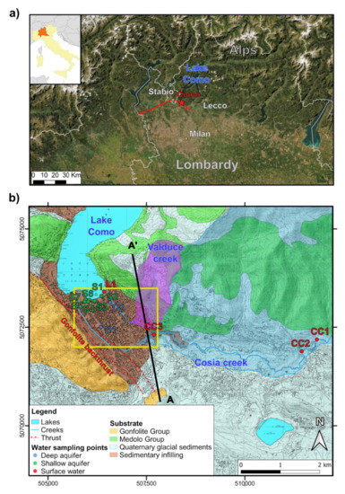 In fact, no data are available on the water chemistry of the Como aquifers, and their main recharge areas are still to be identified. Moreover, this area includes tectonically active structures (i.e., the Gonfolite backthrust [18,19]) and, to the best of our knowledge, their effect on water quality in Como basin has not been investigated yet.