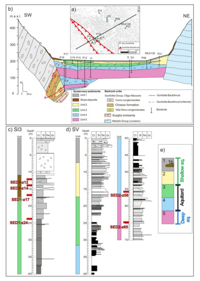 (a) Location of cores SI3 and SV discussed in the text as well as other cores used to provide subsurface control on the stratigraphy (please refer also to Figure 1b), and the trace of the geological cross-section shown in (b). (b) Geological cross-section south-west (SW)–north-east (NE) oriented, perpendicular to the sedimentary basin; vertical exaggeration ca. 2×; modified after [14]. (c,d) Stratigraphic log of cores SI3 and SV, and position of sediment samples. (e) Correlation among stratigraphic and hydrogeological units.