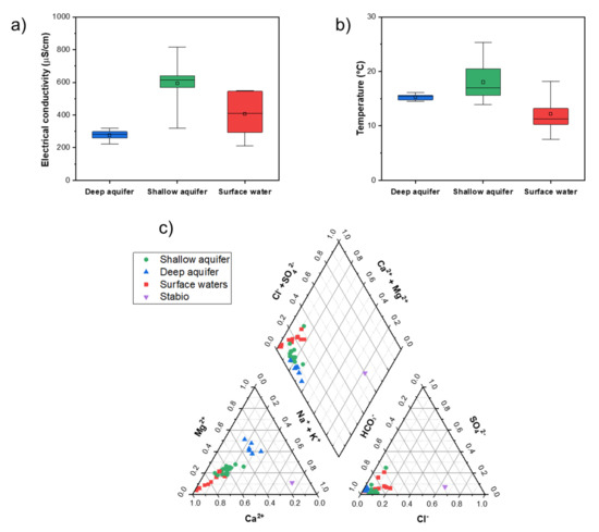 Box and whisker plot of electrical conductivity (a) and temperature (b) of the different aquifer and surface water samples. Boxes indicate the 25th–75th percentile range, whiskers indicate the minimum–maximum range, squares indicate the mean value and horizontal lines the median. (c) Piper plot of all the collected samples.