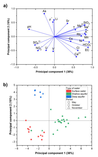 Finally, while the score plot (Figure 4b) shows a strong distinction between the aquifers, it does not show a specific seasonal influence. Water collected in different months are scattered, while samples collected from the three different water types (i.e., the two aquifers and surface water) are generally well separated. This lack of seasonal influence on the aquifer hydrochemistry further supports the existence of different pathways for water recharge for the shallow and deep aquifers, as already pointed out by major ions composition (Figure 3c). Moreover, Ag, Cd, and Pb showed concentrations below the detection limits in more than 50% of the analyzed water samples (Table S3 in Supplementary Materials) and were therefore excluded by the PCA data treatment. This issue indicates a general low level of pollution in the Como aquifers [39,51].