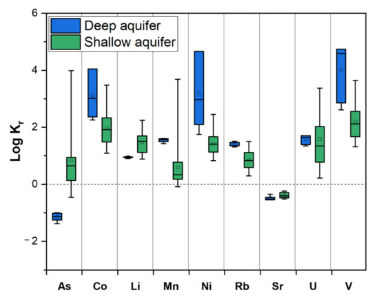 Range of Kr values (in logarithmic scale) of the different trace elements analyzed in water samples of the shallow aquifer (indicated in green) and the deep aquifer (indicated in blue). Squares indicate the average value, horizontal lines the median value, boxes indicate the 25th–75th range, and whiskers indicate the minimum-maximum range.