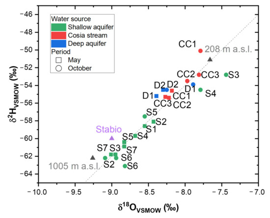 Isotope plot of the Cosia Creek, the shallow and the deep aquifer samples, sampled in May and October 2015. Shaded line indicates the equation of the Global Meteoric water line and 2 points of rain stations in Northern Italy (Andalo for 1005 m a.s.l. and Darfo Boario for 208 m a.s.l., respectively; [59]).