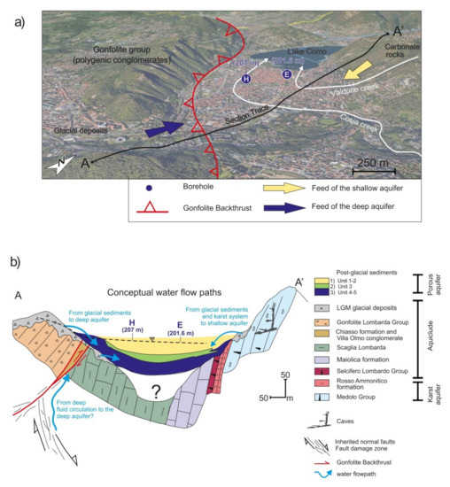 (a) Recharge areas and flow pathways (arrows) feeding the shallow and deep aquifers in the Como region. Section A-A’ is indicated with a black line (see Figure 1b for its detailed spatial location). Boreholes H and E are shown (the reader is referred to Figure 2a for their location on map) together with the elevation of the hydraulic head of the deep aquifer (in parentheses, expressed in m a.s.l.). Basemap: Google Earth imagery. (b) Sketch of the conceptual model for water circulation and recharge areas through the section of Como basin along the section A-A’. Boreholes H and E are also indicated, including the current inferred line of hydraulic head (black dashed line). Details on the different geological formations can be found in [23].