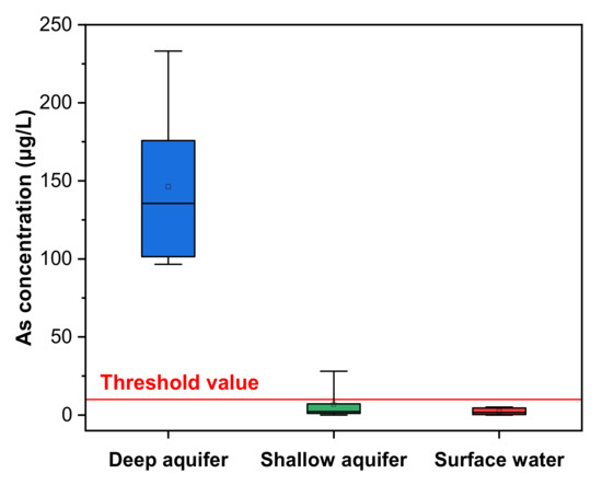Box and whisker plot of As concentration values in the deep aquifer (in blue), the shallow aquifer (in green) and surface water (in red). Boxes indicate the 25th–75th percentile range, whiskers indicate the minimum–maximum range, squares indicate the mean value and horizontal lines the median. The red horizontal line indicates the threshold value for drinking water suggested by WHO.