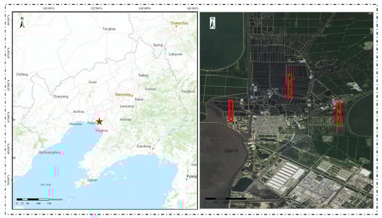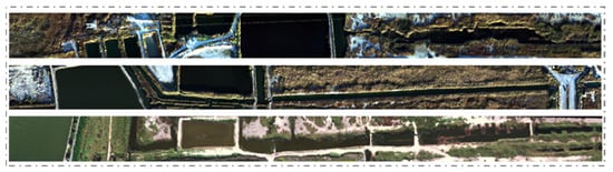 Figure 1 shows the study areas of field data acquisition in this experiment. The field flight tests were conducted in September 2019 and October 2020, respectively, and the images were collected using the Gaiasky-mini2-VN hyperspectral imager, carried by the DJI M600 pro UAV. We obtained three hyperspectral data sets of UAVs. The flight area is located in Dawa District, Panjin City, Liaoning Province. The assignment included a flying area of 0.25 km2 for the Rongxing reservoir and two flying areas of 0.95 km2 for breeding ponds and irrigation canals. Before the UAV took off, a standard gray cloth with reflectivity of 20% and an area of 2 × 2 m had been placed in the aerial photography area. In-flight, the altitude was set at 200 m, the course overlap was set at 55%, the side overlap was set at 40%, and the flight speed was 12.8 m/s.