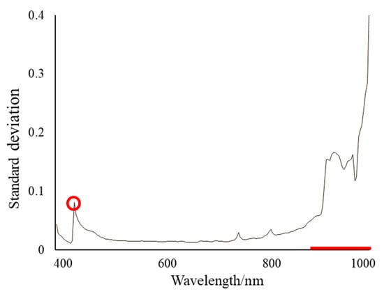 Figure 4 shows the estimated noise standard deviation of the hyperspectral reflectance image. According to the noise shown, the noise corresponds to the blue band near 436 nm and the NIR band after 863 nm. Consider the following modeling process to avoid using the bands in the above range for model building.