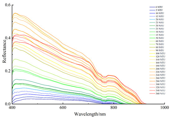In this manual control experiment, we used the turbidity solution with a concentration of 4000 NTU for different concentration configurations. We set a total of twenty-nine gradients of turbidity solution with different interval gradients from 0 to 360 NTU. Moreover, a black box with a volume of 13 L was prepared as a container (38.5 cm × 29.5 cm × 20.5 cm). To reduce the influence of the reflection of the box bottom and the box wall on the water spectral measurement, the black light-absorbing paper, and the light-absorbing adhesive tape were pasted on the bottom and wall before the experiment. However, the effect on water reflectance still cannot be ignored, especially when the concentration of turbidity standard solution is low. Owing to the limited amount of simulated water volume, inhomogeneity of turbidity distribution via volume, and because the water in ponds, irrigation canals, and reservoirs is not perfectly smooth, waves are present. These reasons will limit the ability to use the regression equation obtained in this experiment in natural waters to a certain extent. Therefore, this experiment cannot completely simulate the actual river environment and accuracy estimates are required. To ensure the accuracy of the experiment, we calculated the milliliter required for each adjustment of solution concentration in advance. For the convenience of calculation, we used 12 L distilled water as the initial water sample for the experiment (the turbidity was 0 NTU). We added the corresponding milliliter in turn to adjust the concentration gradient and measured the readings of the configured solution with HACH 2100 q turbidimeter from HACH Company in America to ensure that the error between the concentration of the prepared turbidimetric solution and the set gradient was within 5 NTU. During the experiment, assuming that the background spectrum remains unchanged, the change of water reflection spectrum is caused by the change of turbidity concentration.
