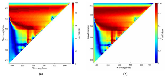 The correlation coefficient distribution, (a) is the distribution of the ratio correlation coefficient in the hyperspectral band; (b) is the distribution of the normalized ratio correlation coefficient in the hyperspectral band.