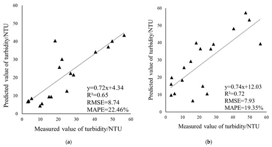 Comparing the predicted values with the measured values of the retrieval model shows that the predicted values were higher than the actual turbidity values. The MAPE was 22.46 and 19.35%, respectively, but the relative trend is consistent with the y = x standard line, R2 is 0.65 and 0.72, respectively. It shows that the two models can retrieve the turbidity of ponds, irrigation canals, and reservoirs in Dawa District of Panjin City, Liaoning Province, and the accuracy is good.