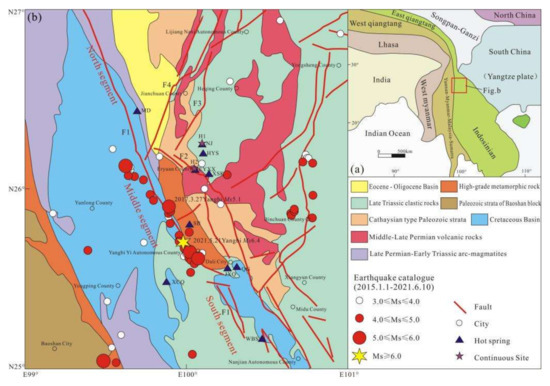 - Chang, Z.F. The seismotectonie background of the 2013 Benzilan M5.9 earthquake, Yunan Province. Seismol. Geol. 2015, 37, 192–207. [Google Scholar]