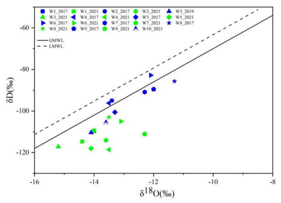 Stable oxygen and hydrogen isotope of the 10 hot springs and their correlations with GMWL and LMWL (the blue and green marks represent the observation results of the first and second phases, respectively) LMWL: δ2H = 8.41δ18O + 16.72.