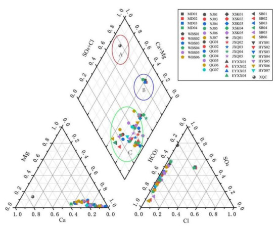 Piper diagram of the spring water samples along WQF. The hot spring samples can be divided into 3 clusters according to the main ions, which are plotted in A (red ellipses), B (blue ellipses), and C (green ellipses) blocks.