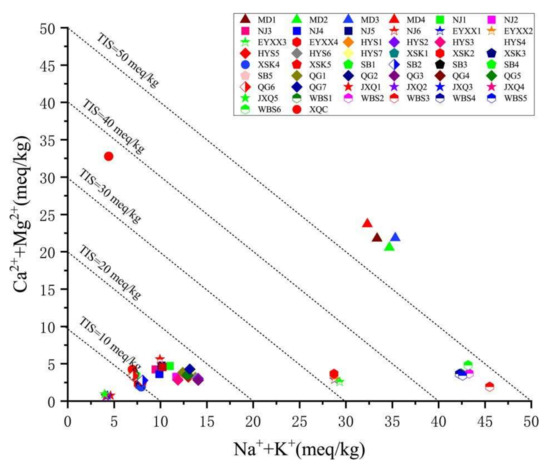 Correlation plot of Na+ +K+ vs. Ca2+ +Mg2+ for the spring water samples along WQF, also showing iso-ionic-salinity (TIS) lines for reference.