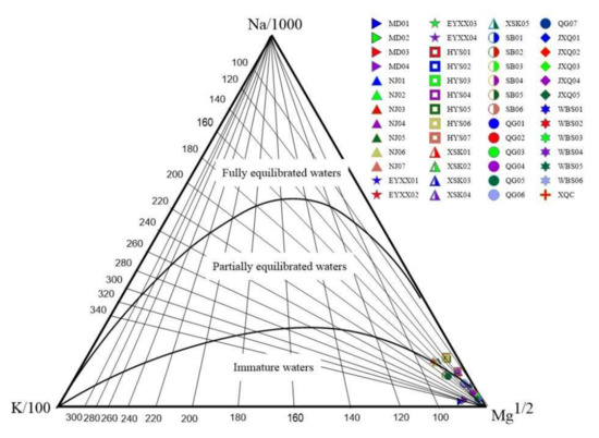 Distribution of aqueous samples on the Na/1000-K/100-Mg1/2 ternary diagram.