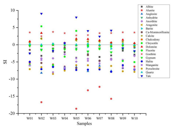 Regarding the analysis of hot spring water samples, the mineral saturation index (SI) is calculated by using PHREEQC software. The results of this study are presented in Figure 6: it can be noticed that all spring water samples are saturated (SI > 0) with respect to goethite, aragonite, dolomite, quartz, barite, and calcite, while chalcedony and fluorite are basically in equilibrium (SI ≈ 0). However, SI with respect to talc varies greatly in each hot spring water. Groundwater samples in W2, W5, W6, W7, and W8 are in a supersaturated state (SI values are 9.07, 7.98, 4.03, 2.4, and 4.15, respectively) and almost in equilibrium if considering W4 (SI = 0.48). However, they are unsaturated in W01, W03, W09, and W10 (SI values are −2.48, −1.72, −0.96, and −1.82, respectively). This phenomenon may reflect the difference in the surrounding rock characteristics. The supersaturation indicates high content of these minerals and long residence time in the aquifer system [56]. However, albite, alunite, anglesite, anhydrite, anorthite, chrysotile, gypsum halite, manganite, and pyrochroite are found in an unsaturated state in the majority of spring waters, indicating that they are relatively soluble or have insufficient reaction time with hot water.