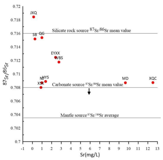 The tritium isotopic composition in hot spring waters can reflect the lithologic characteristics of the strata where they flow. The Sr (strontium) concentration, and the values of 87Sr/86Sr varied from 0.254 to 12.534 mg/L, and from 0.7080 to 0.7184, respectively. The Sr concentration in W1 and W10 springs was approximately 9.6620 and 12.5340 mg/L, respectively. The 87Sr/86Sr ratio of carbonate and sulfate weathering sources is approximately 0.7080, while the one of aluminum silicate is approximately ranging from 0.7160 and 0.7200 (Figure 7). Therefore, except that the W8 hot spring belongs to the silicate mineral weathering, the remnant springs are between carbonate and silicate mineral weathering, indicating that they are formed by the interaction with Sr-bearing rocks in the crust during the deep circulation of atmospheric precipitation in the local heat flow system, consistently with the results of hot spring chemistry.