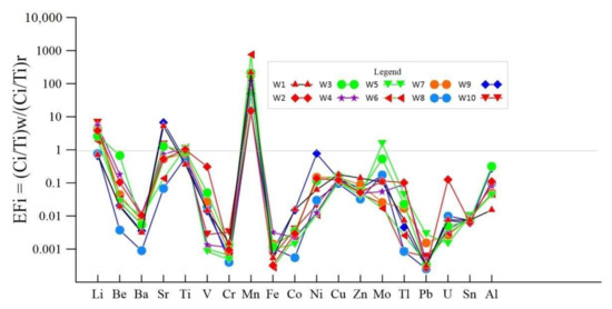 where Ci is the content of an element in the sample, Ti is the content of the selected reference element (Ti), w is the concentration of the element in the water sample, and r is the concentration of the element in the rocks of the study area. In this study, 19 types of trace elements were measured, including Li, Be, Ba, Sr, Ti, V, Cr, Mn, Fe, Co, Ni, Cu, Zn, Mo, Tl, Pb, U, Sn, and Al. Spring waters of the WQF are compared with the corresponding trace element average compositions of the multiple phase granitic rocks in the northern and middle segment of DianCangShan–AiLaoShan. The rock chemistry is discussed in the reference of Ji et al. [63]. The EFi of Mn is higher in respect to others (Figure 8); this element is widely distributed on Earth and is more common in granite. Generally speaking, hot spring water mainly contains the carbonatite of divalent Fe and Mn, which are dissolved by hot spring waters. In addition, except for W1 and W8, Li is enriched: its concentration in W9 springs is up to 2047 μg/L, while in W2, W3, W5, and W6 hot springs, it is over 1000 μg/L. Li is an active element with high hydrolysis energy, which is easily enriched in hot spring water and is the signature element of deep liquid upwelling [64]. Volcanic rocks are widely distributed in the study area, so the Li content in hot springs around the fault zone is high. In addition, due to the activity characteristics of Li, it is likely to become a symbolic element of deep liquid upwelling during deep fault activity. In addition, Sr is relatively enriched in W1, W6, W9, and W10. Sr is an alkaline earth metal dispersed element, abundant in the crust and mantle, and its migration is closely related to Ca. In addition, Sr is more easily enriched in weak alkaline water with pH 7.0–8.5 [65]. Due to the carbonate and clastic components developed around the Weixi–Weishan area, the pH value of spring samples ranged from 6.62 to 8.24, which is typical of weak-alkaline waters. The overall EFi and the content of trace elements are relatively low: the Na-K-Mg triangle showed that the hot spring waters in the area are in the intersection line of partial equilibration zone and immature water zone, thus indicating that the degree of water–rock reaction was relatively weak in the study area.