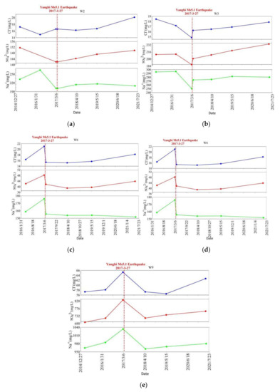 There have been three earthquakes with Ms ≥ 5.0 in the study area since 2015: the Eryuan Ms5.0 earthquake on 18 May 2016, the Yangbi Ms5.1 earthquake on 27 March 2017, and the Yangbi Ms6.4 earthquake on 21 May 2021 (Figure 1b). In annual continuous data of spring waters, abnormal variations were detected in springs W2(NJ), W3(EYXX), W6(SB), W7(QG), and W9(WBS) in 2017, of which W2(MD) and W3(NJ)are located to the north of the earthquake, while the others are to the south, which could be considered as the result of the influence of the Yangbi Ms5.1 earthquake, as they were detected in the absence of extreme weather, such as precipitation changes, which were detected when precipitation did not occur. The anomaly characteristics and epicentral distance in the hot springs are shown in Table 3. Springs W2 and W3, which are 44–45 km away from the epicenter, showed that Na+, Cl−, and SO42− significantly decreased before the earthquake: Na+ in W2(NJ) decreased by 23.80%, while Na+, Cl−, and SO42− in W3 decreased by 15.10%, 13.70%, and 11.20%, respectively, from April 2016 to February 2017. However, it is worth noting that to the south of the earthquake, Na+, SO42−, and Cl− of W6(SB), W7(QG), and W9(WBS) showed a significant increase before the earthquake. Moreover, Na+, Cl−, and SO42− in W6, which is 16 km away from the epicenter, increased by 10.82%, 28.45%, and 14.45%, respectively, while in W9, 100 km away, they increased by 5.0%, 12.33%, and 14.84%, respectively; Na+ and SO42− in W7, 54 km away, increased by 8.95% and 6.62% from April 2016 to February 2017, respectively (Figure 9).