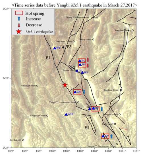 - Shi, Z.; Zhang, H.; Wang, G. Groundwater trace elements change induced by M5.0 earthquake in Yunnan. J. Hydrol. 2020, 581, 124424. [Google Scholar] [CrossRef]