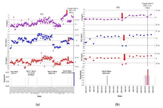 Temporal variations in concentration of Na+, Cl−, SO42− and related earthquake. (a) is stand for NJ spring; (b) is stand for EYXX spring. Purple bars show the earthquakes of 3.0 ≤ Ms < 4.0 within 120 km. Green bars show the earthquakes of 4.0 ≤ Ms < 5.0 within 150 km. Red bars show the earthquakes of Ms ≥ 60 within 300 km. There were no earthquakes of 5.0 < Ms ≤ 6.0 during the observation period.