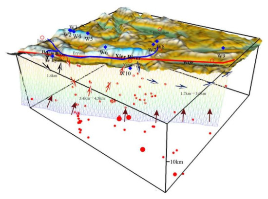 We investigate the hydrogeochemical characteristics of 10 hot spring sites located along the WQF by investigating their major and trace elements as well and hydrogen and oxygen isotopes, as well as the characteristics of changes in the hydrogeochemical characteristics of hot springs relative to earthquakes in the region, especially the Yangbi Ms5.1 earthquake on 21 March 2017, and the Yangbi Ms6.4 earthquake on 21 May 2021. The following preliminary conclusions can be drawn from the study of the hydrogeochemical characteristics of hot springs in the region. The hot spring waters in the WQF were recharged by infiltrated precipitation, and the recharge elevation range is 1.9–3.1 km. The hydrochemical types of most geothermal waters, mainly controlled by aquifer lithology, are HCO3SO4–Na (W2, W3, W4, W5, W6, W7, W8, and W9), except for two samples being SO4Cl–NaCa (W1) and SO4–Ca (W10). The heat storage temperature range was inferred from an equation based on SiO2 concentration and chemical geothermal modeling as 44.1 °C–101.1 °C. The depth of circulation of the thermal springs varies between 1.4 and 4.3 km. Compared with the middle section, the hot spring circulation depth of the northern and southern sections is shallower.