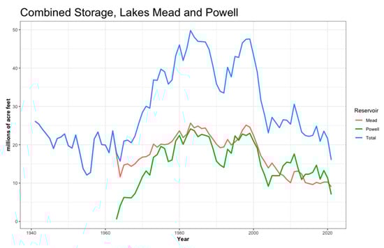 On the water supply side, the river’s users face two problems. First, 20th century expectations used as the premise for development of the dams and distribution systems were based on overestimates of the river’s available supply [44]. Thus, even without climate change, the reservoirs would likely be declining as water use outstrips supply. However, the imbalance is exacerbated by the already experienced climate change-driven declines in the 21st century and the risks of substantial further flow reductions [13,14,15,41].