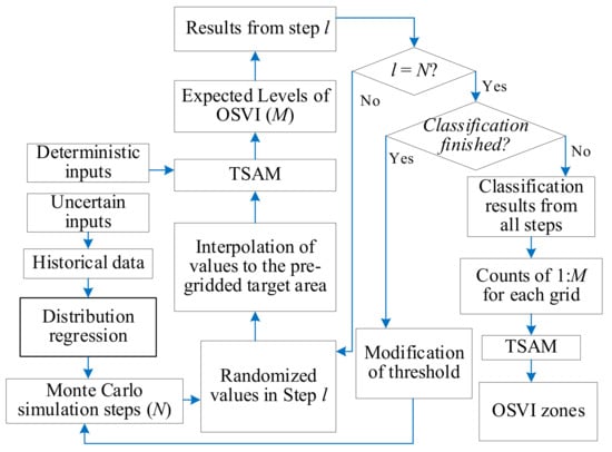 To address above concerns, the authors have previously developed an MC-TSAM approach for OSVI determination and risk zone classification [30,31]. This approach was an advance of the TSAM approach which was also previously developed by the authors based on the adaptive resonance theory (ART) and the ART mapping (ARTMap) neural network [32,33]. The framework of MC-TSAM is shown in Figure 1, where N is the total number of the Monte Carlo simulation, and l is one of the Monte Carlo simulation steps. The approach can process inputs with a mixture of deterministic and uncertain values. For the uncertain inputs, such as current and wind speeds, distributions with best fitness were first generated according to distribution regression on historical data. Accordingly, the statistics of distributions were summarized and applied to the Monte Carlo simulation for randomized number generation. In each step of Monte Carlo simulation (step l), one set of randomized numbers, as well as the deterministic values, were interpolated to the preset grids of the target area and then fed to the TSAM for OSVI analysis. With a number (e.g., N) of Monte Carlo simulation steps, the MC-TSAM is able to provide reasonable OSVI classification for a target area with consideration of complexity and uncertainty.
