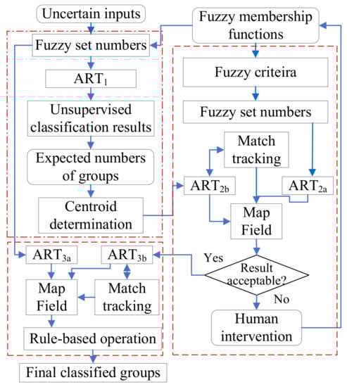 To address the above challenge, the authors integrated the ART/ARTMap model and fuzzy set theory to develop an integrated, rule-based fuzzy adaptive resonance theory mapping (IRFAM) approach (Figure 2) [32,33]. Such an approach can efficiently handle the classification with the coexistence of complexity and uncertainty. In the IRFAM approach, the original inputs with uncertain conditions are firstly fuzzified based on the fuzzy set theory. The fuzzified inputs are then classified by unsupervised classification with ART1. Based on the desired number of the final group by the method described in the TSAM approach [33], as well as the centroid determination module, the criteria combinations generated by the fuzzy set generation module are finally classified.