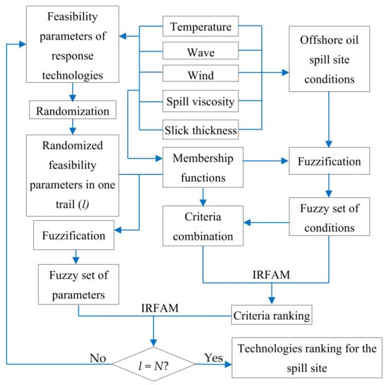 In order to address the uncertainties of data, the IRFAM approach was further advanced in this study, by coupling with a Monte Carlo simulation, yielding a Monte Carlo simulation-based IRFAM (MC-IRFAM) approach (Figure 3). This approach can produce random numbers based on the feasibility range of parameters with distribution regression. Accordingly, the availability and feasibility of response technologies can be screened and ranked based on the spilled site conditions. With a certain number of Monte Carlo simulation steps, the overall score reflecting the feasibility of the technologies can also be generated.