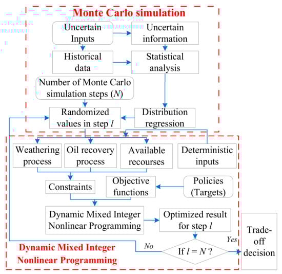 To address the above concern, a Monte Carlo simulation-based, dynamic, mixed-integer nonlinear programming (MC-DMINP) approach was previously developed by the authors to effectively and dynamically support offshore oil spill response [37,38]. The general framework of the MC-DMINP is shown in Figure 4. In each Monte Carlo simulation step, a set of random values is generated based on the regressed distribution of uncertain parameters, converting the uncertain problem to a deterministic one at this step. With the completion of all Monte Carlo simulation steps, the distribution of solutions is generated and further analyzed with a trade-off decision.