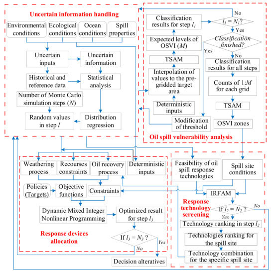 Oil spill management, especially oil spill response, is always constrained and challenged by a series of dynamic and interactive processes under various degrees of uncertainties. These uncertainties can be caused by the properties of oil spills, environmental conditions and the efficiency of response devices or equipment, along with the different weathering degrees of spills [7,8,9,10,11]. The optimization of management strategies and resources allocation can be highly beneficial in improving oil spill management efficiency [12]. So far, some decision support systems (DSSs) for oil spill management have been reported [13,14]. Pourvakhshouri et al. [15] developed a DSS based on a geographical information system (GIS) to support oil spill management in the Strait of Malacca. Some offshore oil spill diagnoses and/or alert models were also developed either with or without geomatic analysis [16,17], including the oil spill risk analysis (OSRA) model, the oil spill information system (OSIS) [18], the general national oceanic and atmospheric administration (NOAA) operational modeling environment (GNOME) [19,20], etc. Nevertheless, these models specified response technologies only with consideration of experience, without support from optimization, and nearly always involved approaches to handle uncertainties which existed throughout oil spill management [21]. Although DSS-integrating oil spill simulation, strategy optimization and uncertain information handling could significantly increase the efficiency of offshore oil spill management, this kind of DSS was still not reported in literature [22].