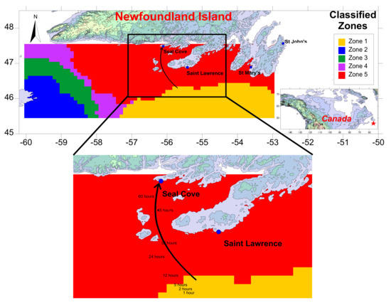 The wind and current field data were downloaded from the GOODS (GNOME Online Oceanographic Data Server) of the National Oceanic and Atmospheric Administration (NOAA). According to Equations (10)–(12), as well as the wind and current field data, the trajectory of the spill slicks was simulated with a time step of 1 min and a simulation window of 60 h. The result is shown in Figure 6, which indicates that if no response action was applied, the spilled oil would contaminate the shoreline area of Newfoundland about 60 h after the release.