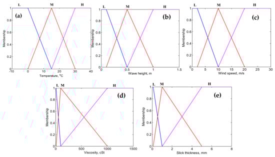The membership functions of (a) seawater temperature, (b) wave energy/height, (c) wind speed, (d) oil viscosity and (e) slick thickness.