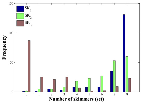 The MC-DMINP modeling results are illustrated in Figure 8, Figure 9, Figure 10, Figure 11, Figure 12, Figure 13, Figure 14, Figure 15 and Figure 16. The distributions of skimmer numbers indicated the highest probability of deployed SK1 and SK2 were eight sets and the number of SK3 heavily depended on the vacancy of the vessel capacity (Figure 8). Since there were only eight sets of SK1 and SK2 in total, and the capacity of vessels was 20 sets of skimmers, the optimal combination would be SK1: eight sets, SK2: eight sets and SK4: eight sets. Based on this combination and the simulation-optimization coupling approach, the transport and behavior of the spilled oil were simulated. The results indicated that most of the oil was removed from sea surface about 45 h after the release and would not reach the shoreline area of Newfoundland (Figure 9).