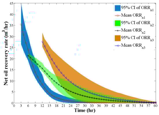The overall ORRn of skimmers was decreasing with time, mainly due to the decrease in slick thickness. The decrease of efficiencies was significant in the early 24 h and became insignificant thereafter (Figure 10). Generally, the uncertainties of all the skimmers’ efficiencies appeared to have positive correlations with the uncertainties in seawater temperature, wind speed and slick thickness. In addition, the seawater temperature and wind speed in Zone 1 and Zone 5 posed a significant influence on the oil weathering and, subsequently, the oil recovery process because their values in these zones followed the generalized extreme value (GEV) distribution. Also, Figure 16 indicates significantly positive correlations between the oil evaporation and the parameters, including seawater temperature, wind speed and slick area. Very significant correlations were observed between the wind speed, the processes of oil recovery (negative), evaporation (positive) and dispersion (positive). In addition, the correlations between seawater temperature and the processes of oil recovery, dispersion and evaporation were none, significantly negative and significantly positive, respectively. The uncertainty of slick area appeared to be positively correlated with oil evaporation and dispersion and negatively correlated with oil recovery.