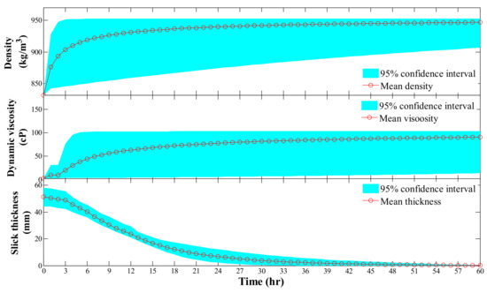 Simulation results of oil viscosity and density, as well as slick thickness.