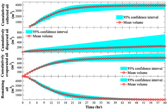 Due to the previous simulation of oil slick trajectory, if no offshore oil spill response was applied, the spill would contaminate the shoreline area of Newfoundland 60 h after the release (Figure 6). Correspondingly, the target of the oil spill response was to perform a fast and effective clean-up of the spilled oil within 60 h. Furthermore, no additional device would be applied during this period due to the challenges in distance and transportation.