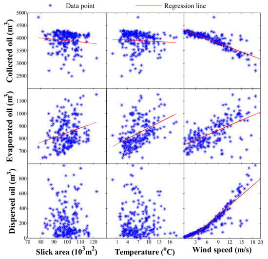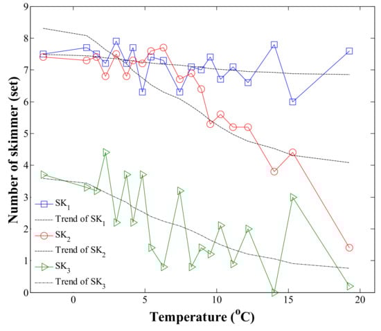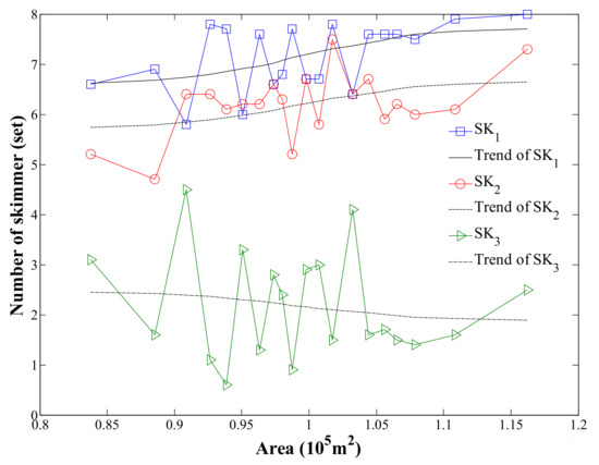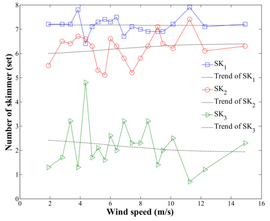 The final oil budget was 82% collection (4096 m3), 14.4% evaporation (724 m3) and 3.6% dispersion (180 m3). Figure 10, Figure 11, Figure 12, Figure 13, Figure 14 and Figure 15 show the simulation results regarding ORRn changes, oil collection, evaporation and dispersion, as well as the changes in slick thickness, oil density and viscosity. The number of SK1 and SK2 appeared to have significantly positive correlations with the initial slick area. The number of SK3 appeared to have a negative correlation with the initial slick area but was not significant (Figure 13). Furthermore, the wind speed had a positive correlation with the number of SK2 and a negative one with the number of SK3. Its correlation with the number of SK1 was not observed (Figure 14). Since the oil dispersion process was enhanced by strong wind 1 day (24 h) after the release (Figure 12), the skimming efficiency was significantly affected (Figure 16). As a result, SK1 and SK2 that required a shorter time of deployment were preferred compared to SK3 which required a much longer time for deployment. Strong negative correlations were observed between SK3/SK2 and the uncertainty of seawater temperature, while the correlation between SK1 and seawater temperature was insignificant. The possible reason might be the positive effects of seawater temperature on the oil evaporation processes. In addition, the SK2 and SK3 were more influenced by this effect because their ORRs were more sensitive to uncertainty when compare to SK1.