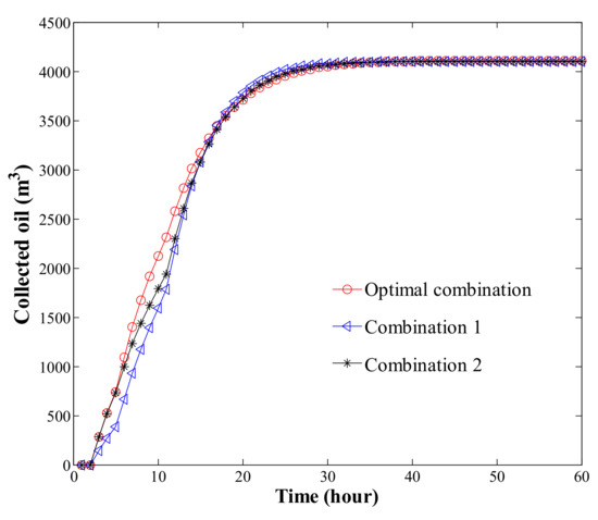 The performance of the optimal skimmer combination {SK1: eight sets, SK2: eight sets and SK3: four sets} was also compared with the combinations of {SK1: four sets, SK2: eight sets and SK3: eight sets} (Combination 1) and {SK1: eight sets, SK2: four sets and SK3: eight sets} (Combination 2). Figure 17 shows the comparisons in oil recovery. Although the oil collection based on the optimal combination (41.0%) was close to the other two combinations’ (40.9%), it appeared to have a significant advantage in the early stage (e.g., the first 15 h). This was of great importance to ecosystem protection because the oil slick was approaching the islands of Saint-Pierre, France and Burin Peninsula, Newfoundland, Canada, about 15 h after the release. The elimination of spilled oil before this time point was urgently needed and the optimal combination was the best one in this case.