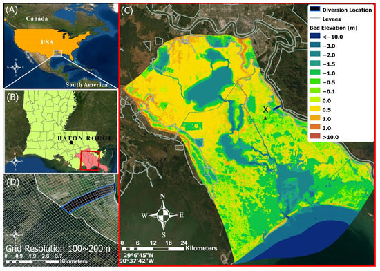 Study site and model domain. (A) Location of Louisiana state within the Unites States of America; (B) location of Barataria basin within the state of Louisiana; (C) digital Elevation Map (DEM) data in (m-vertically referenced to North American Vertical Datum NAVD-88); and (D) grid distribution at location (X) in the outfall area of the diversion where grid resolution is 100:200 m.
