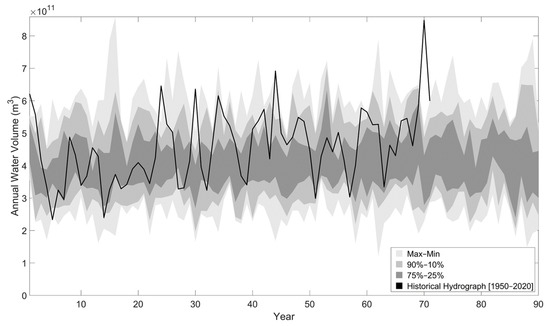 Statistical summary of 16 projected hydrographs for the Lower Mississippi River at the Tarbert Landing, Louisiana station. The historically recorded hydrograph at the same station from 1950–2020 is shown for comparison.