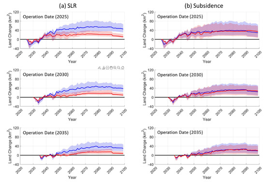 (a) Effect of 1-m (blue line) and 2-m (red line) sea level rise (SLR) and (b) subsidence (CMP2017—blue line; and BYRNES T19 is red line) on the net land change by 2100. The top row is assuming operation date of 2025, while the middle row is for 2030, and the bottom row is for 2035.