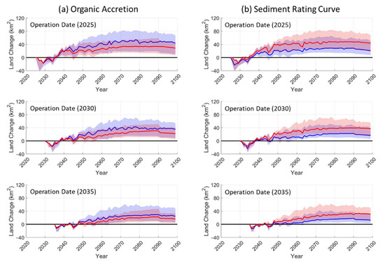 Effect of organic accretion and mineral sediment rating curves on net land change. Panel (a) is for organic accretion rates where the blue line represents the 5-mm rate and the red line represent the mineral only permutations. Panel (b) is for the mineral sediment rating curves where the blue line represents the USGS rating curve, while the red line represents the HYST rating curve. The top row is assuming operation date of 2025, while the middle row is for 2030, and the bottom row is for 2035.