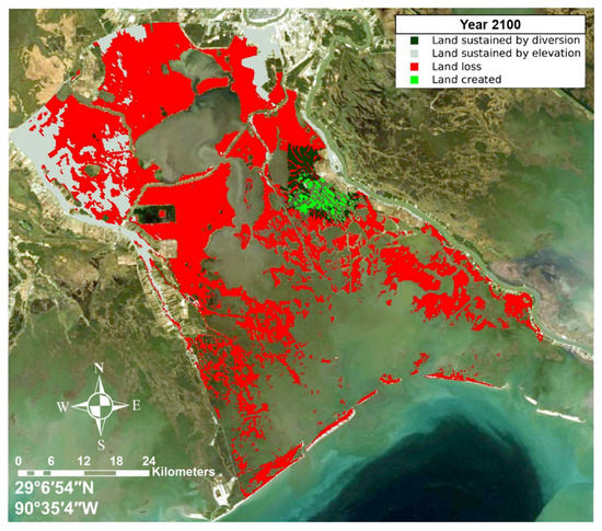 Figure 5 shows an example of land change map at year 2100 for one of the permutations. The two SLR rates used in the analysis produced distinct net land change outcomes. Not only the median results were clearly distinct, the 25th–750th range of the 2-m SLR hardly overlaps with the 1-m scenario even for the 2035 operation date. This highlights the sensitivity of the system response to SLR as an environmental driver. The organic accretion, as shown in Figure 4, shows clear increase in the net-land change, although the overlap between the two scenarios (zero accretion rate and 5 mm/year accretion rate) is significant. This signifies the importance of the organic contribution to the vertical elevation of the marsh surface. Establishing vegetated surface, as early as possible, adds significant increase in the annual elevation gain, thereby ameliorating the influence of SLR and subsidence.