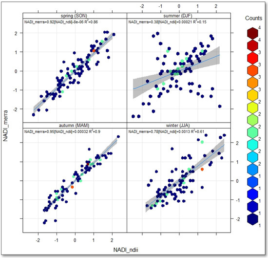Figure 5 and Figure 6 show the correlation between NADI calibrated with NDII and MERRA–2 and the seasonal correlation of the former indices. The correlation coefficient (R2) between the two indices is 0.58. This shows that a positive relationship exists between the NADI calibrated with NDII and MERRA–2. For the case of seasonal correlation, autumn, spring, winter, and summer reported an R2 of 0.9, 0.86, 0.61, and 0.15, respectively. The results show that in the summer season, the correlation between the two indices was significantly weak while the autumn was strong.