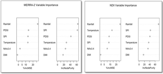The low correlation reported may be influenced by each respective index calibrating variable, for instance, SPI is precipitation based while NADI considers all aspects of the hydrological cycle and therefore may tend to underestimate events that are highly noted by the SPI. The analysis of variable importance with RF showed that the most important variables influencing NADI-NDII and NADI-MERRA–2 was rainfall with an increasing mean square error (%IncMSE) of more than 25% as shown in Figure 7.