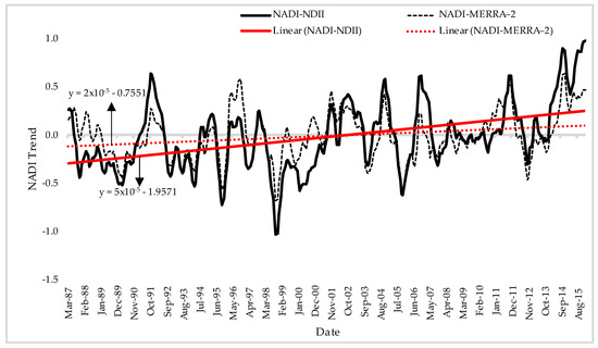 The trends analysis and its significance of the NADI time series was also performed in this study. The trend analysis was deduced by fitting the line of best fit in both the NADI-NDII and the NADI-MERRA–2, respectively. The results showed that the indices (NADI-NDII and NADI-MERRA–2 time series) reported a significant positive drought trend at a 95% confidence interval. The smooth linear trend depicted in Figure 9 supports the MK trend results as it shows an increasing positive trend.